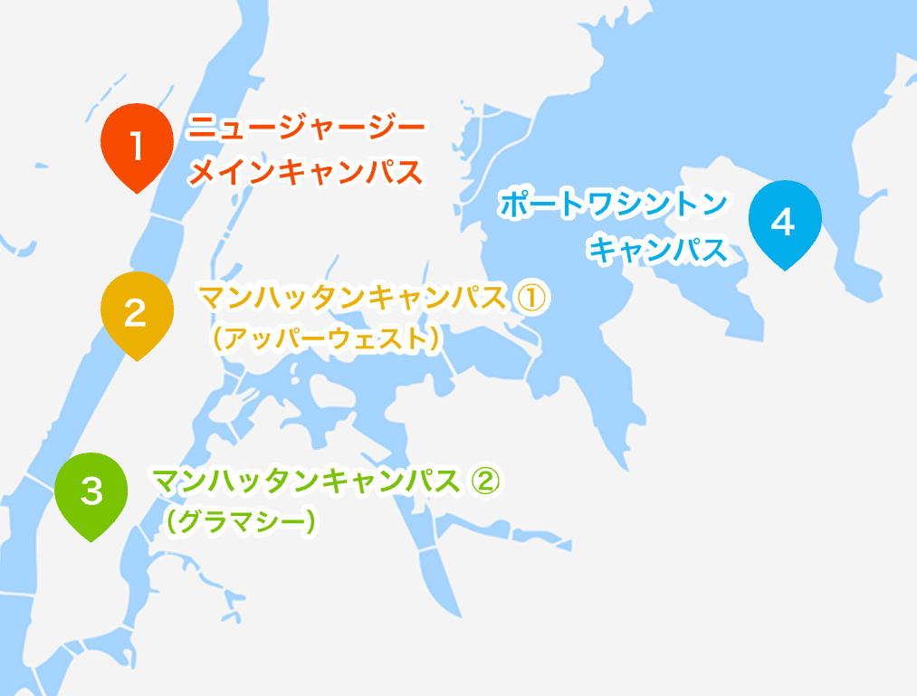ニューヨーク育英学園では「ニュージャージーメインキャンパス」「マンハッタンキャンパス➀(アッパーウエスト)」「マンハッタンキャンパス➁(グラマシー)」「ポートワシントンキャンパス」の4つのキャンパスを運営しております。